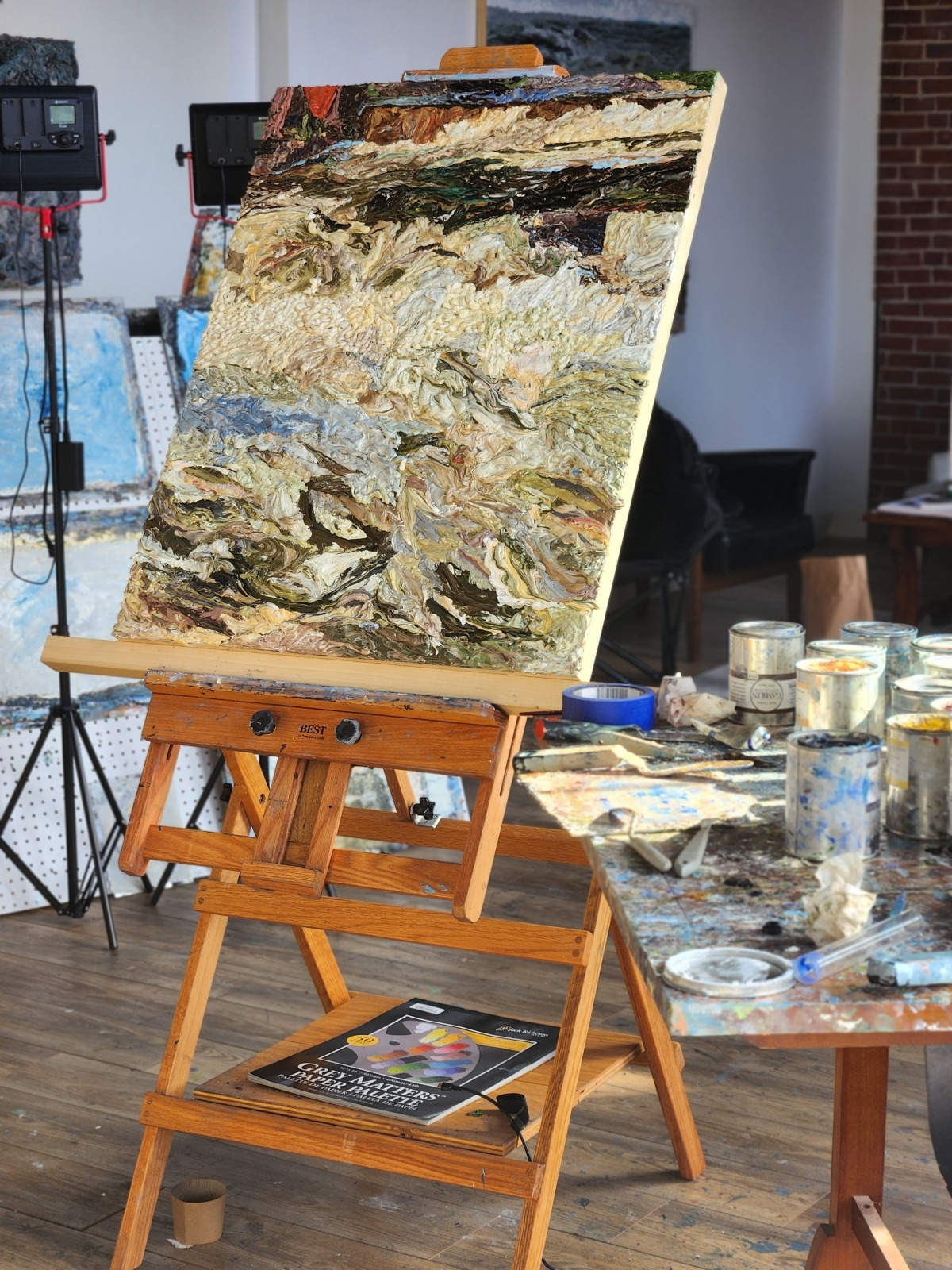 David Clough visited today to photograph my completed and in-progress works. One of the biggest challenges in sharing my art is getting high-quality photographs. My works have such varied surfaces that the light cast on them misrepresents what's truly there. After discussing this with David, I wanted to capture a few shots of my process from his perspective—to demonstrate my painting technique and see it through his eyes.