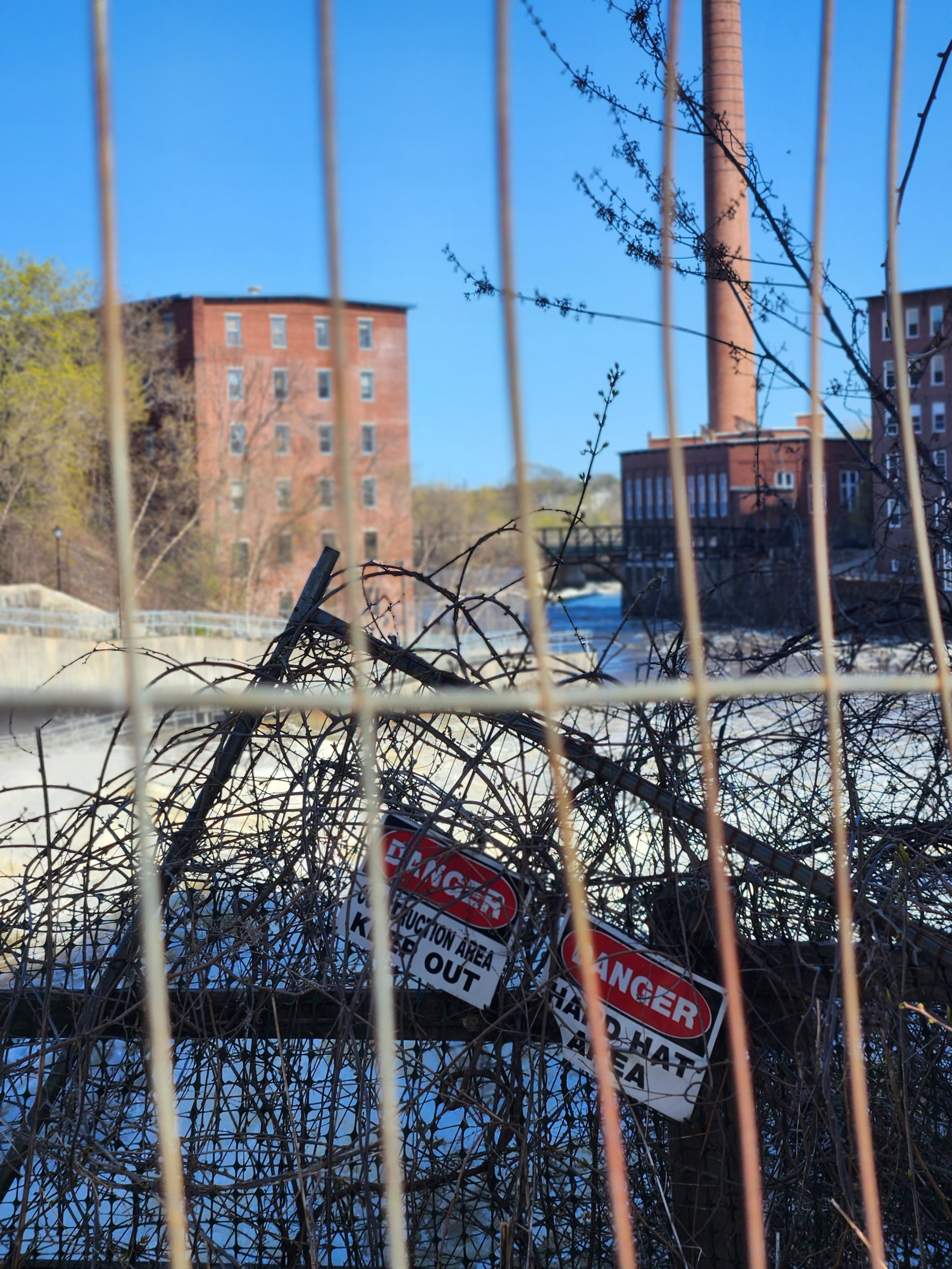 When we finally came upon the water, it was furious. Flowing green and yellow river water crashed through, turning white in an instant as it sloshed about the rocks, stones, and equipment from an era long since past. The looming brick buildings transformed the river beneath their shadows into hues of purple and blue. There was a beauty in the hard rectangular lines of the buildings cutting over the river, as if I were looking through a blue bottle.